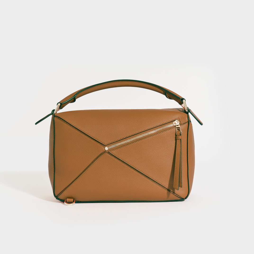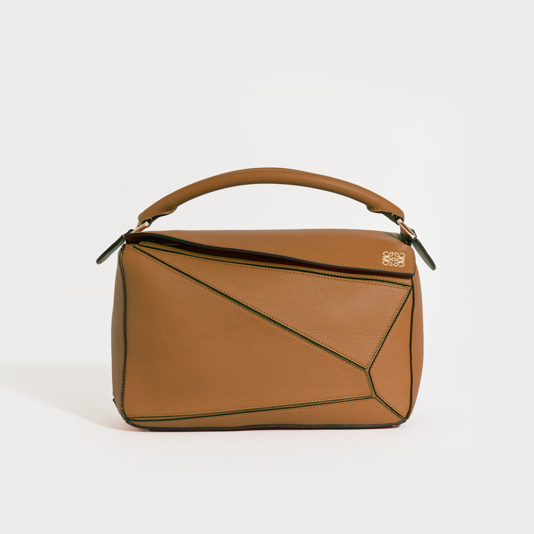 Indulge in luxury with the Loewe Medium Puzzle Smooth Leather Bag. Handcrafted in Spain, this is the original Puzzle design, featuring geometric panelling crafted from 95 pieces of leather. The larger size can easily carry your daily essentials, while the adjustable strap and top handle allows you to wear it as a crossbody, shoulder bag or hand-held.