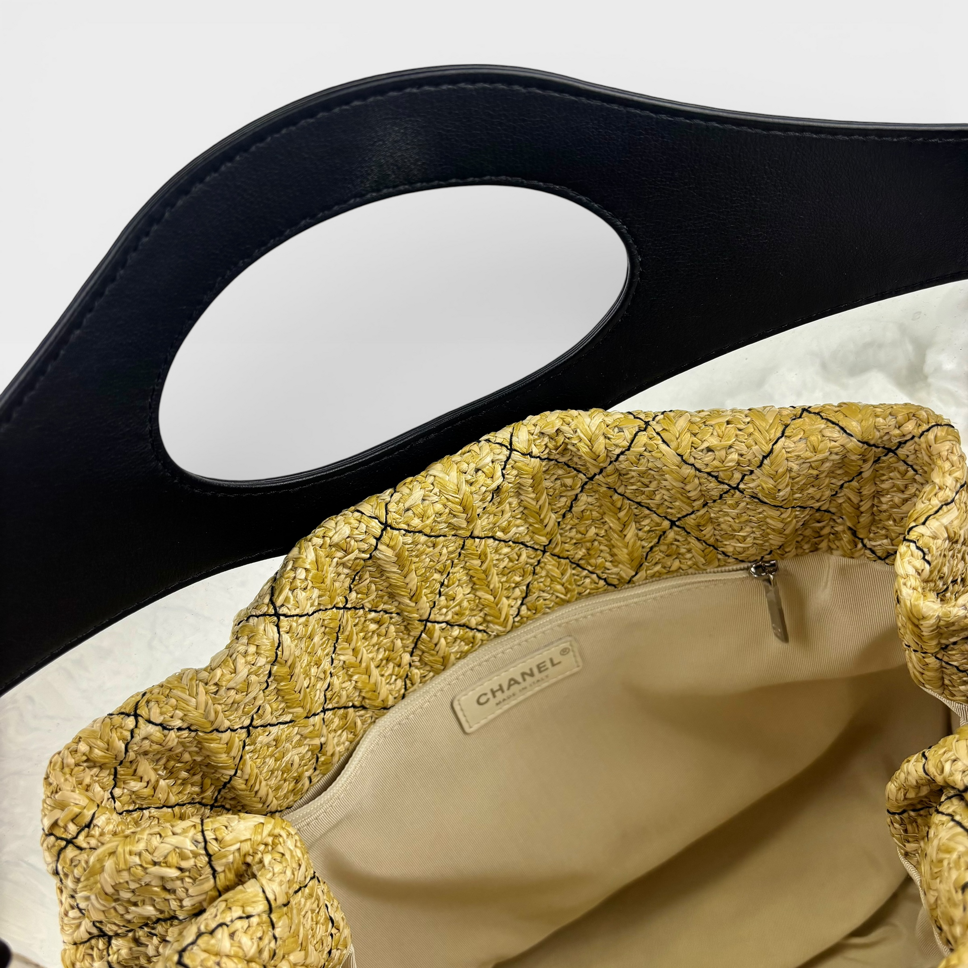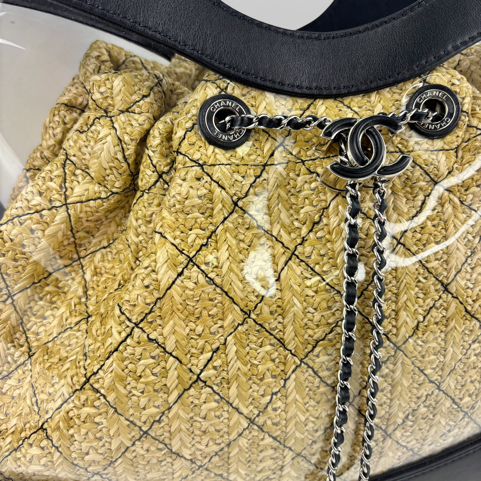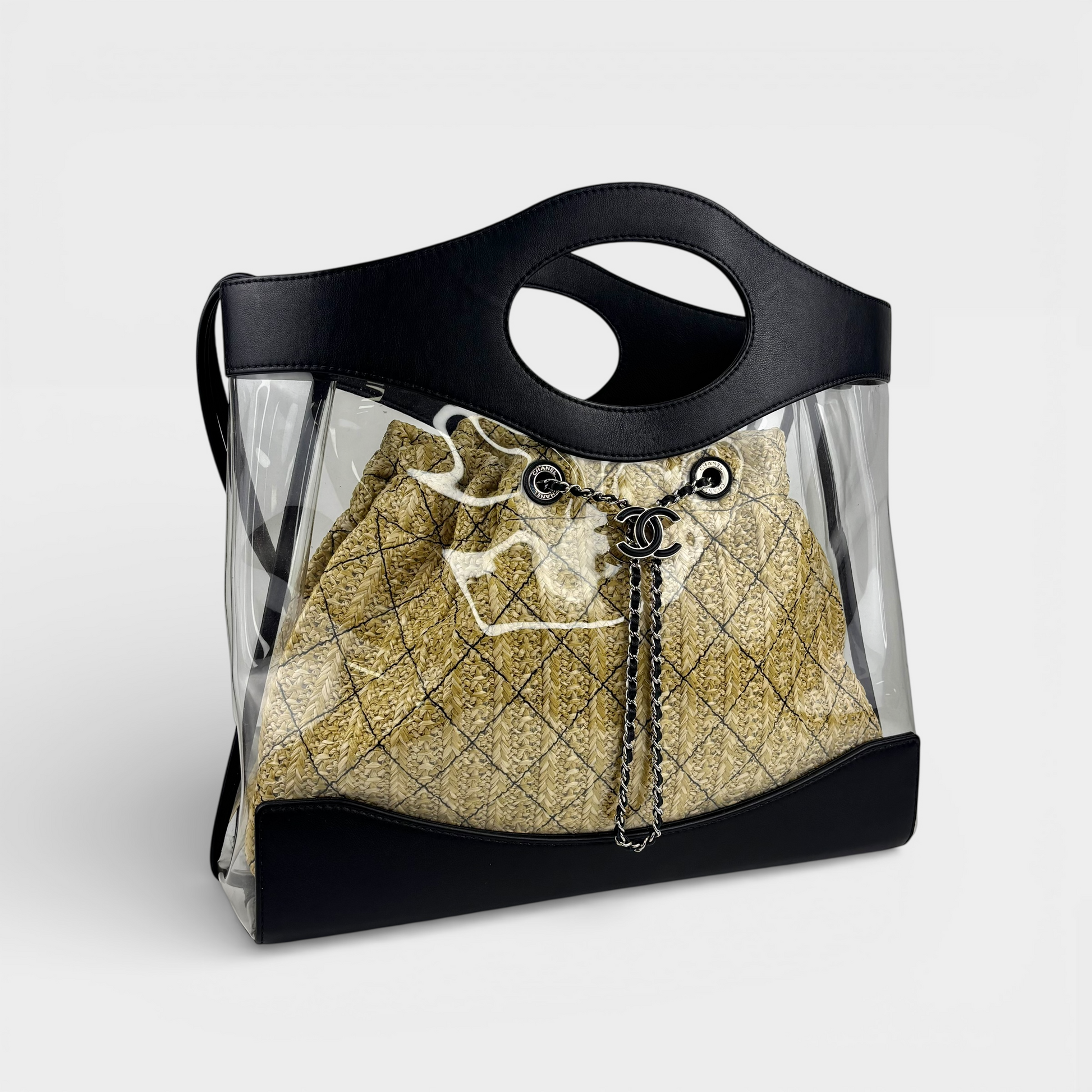 Straight from the sand-swept runway, the Chanel 31 Large PVC Shopper from Spring 2019 captures Karl Lagerfeld’s playful take on seaside glamour. Crafted from clear PVC, raffia and calfskin leather with black lambskin trim, this statement tote features a single leather shoulder strap alongside two structured top handles, finished with silver-tone hardware and a signature CC drawstring closure. Seen on the Chanel “beach” inside the Grand Palais, it was styled with effortless resort looks and barefoot ease - the ultimate summer carryall with fashion history built in.