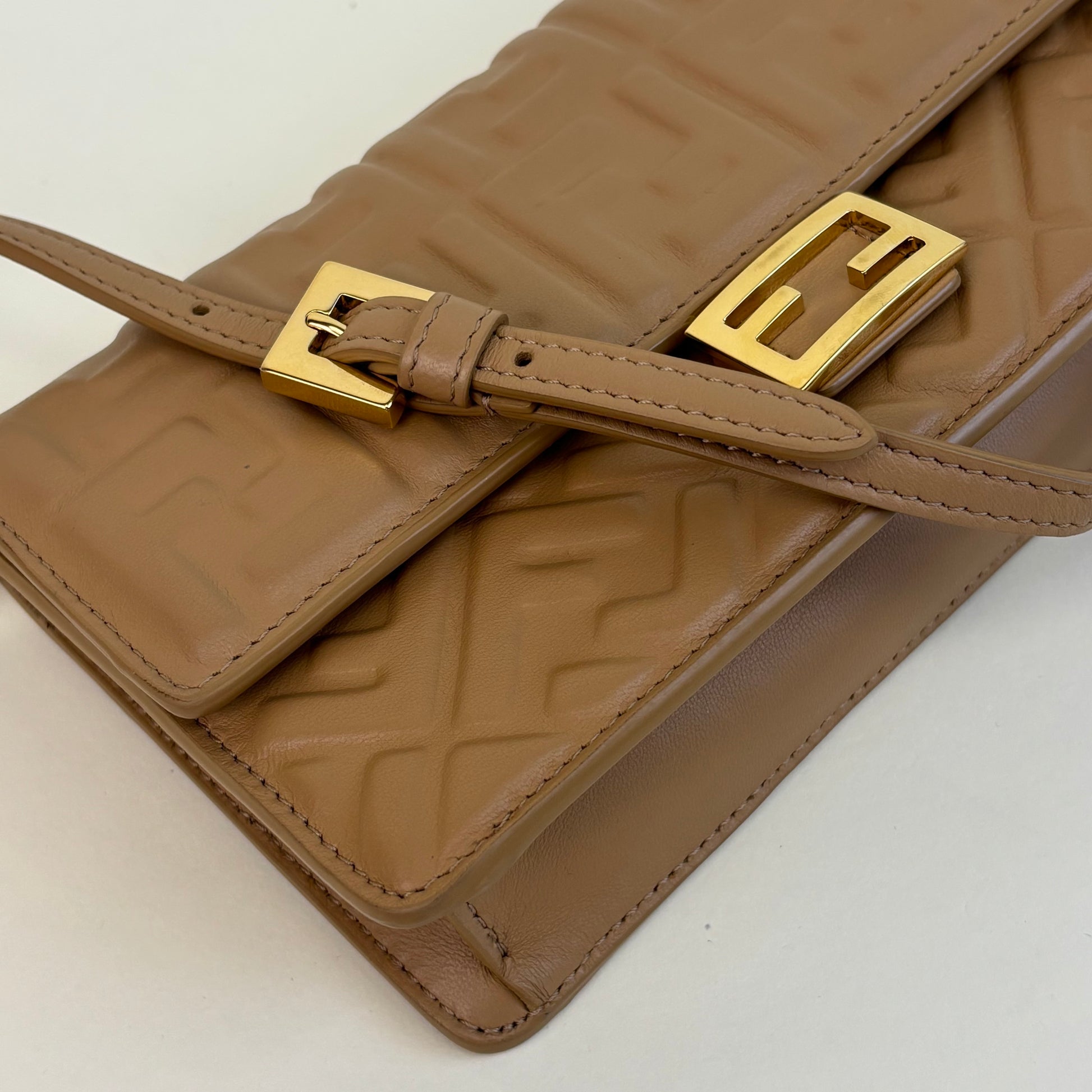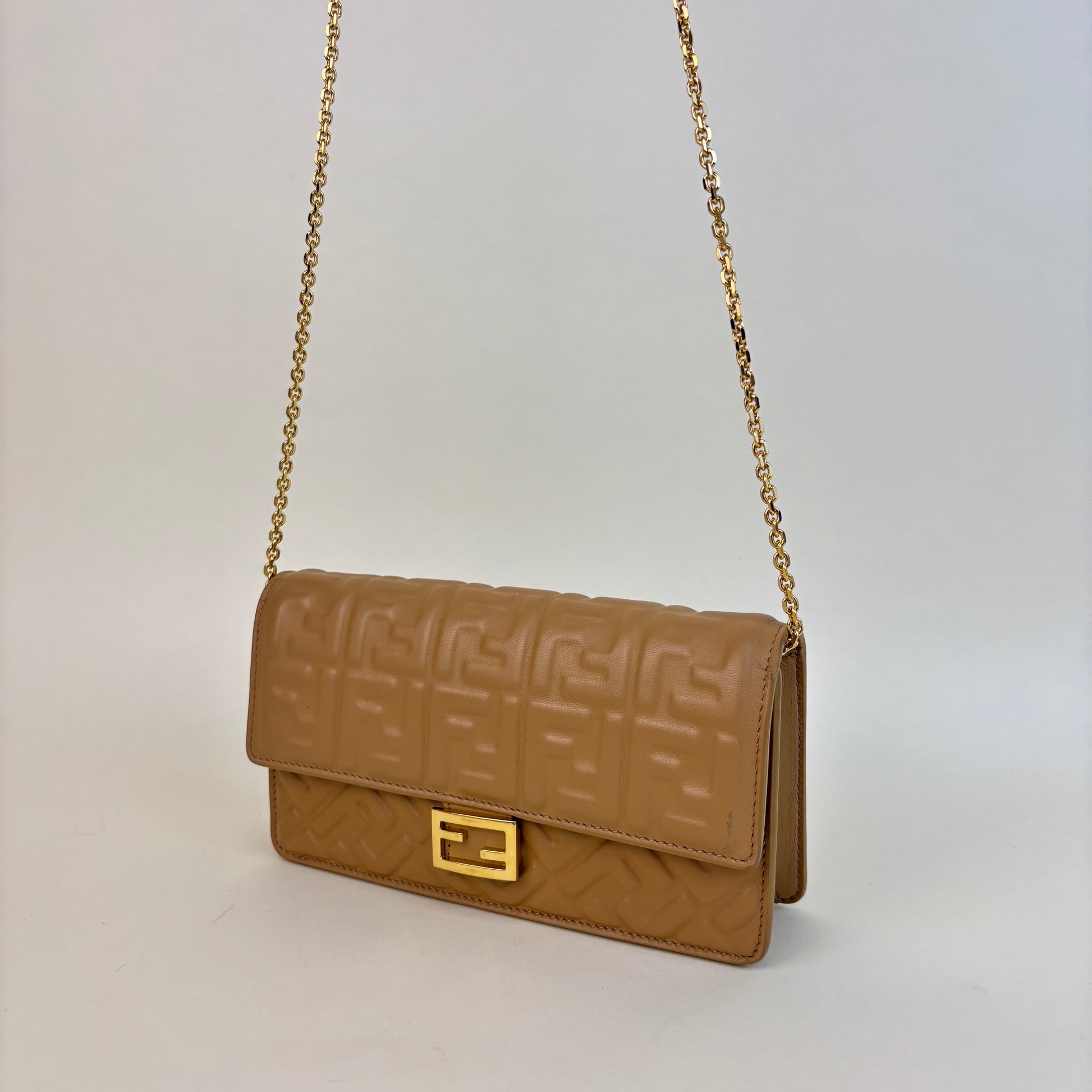 Say hello to the Fendi Baguette FF Wallet on Chain in Beige. The all-important double F monogram is embossed on the leather exterior enclosed by the iconic logo fixture in gold hardware, it exudes a sophisticated yet modern charm. With two removable straps, you've got endless styling options - choose to carry by hand, wear over the shoulder or as a crossbody with the chain and leather straps. Easy to wear, with enough room for the essentials while completely transcending seasonal trends, this bag is an all-rounder.