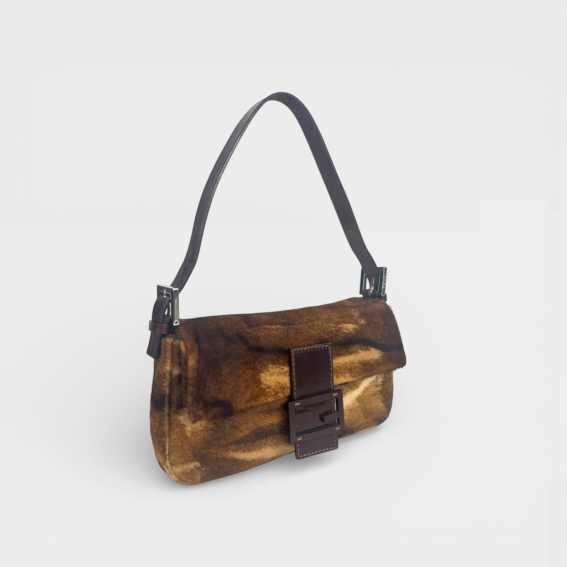 The Fendi Baguette in Brown Pony Hair is a true wardrobe icon and one of the original “It Bags” that sparked a global obsession. Crafted from tan and brown pony hair with brown leather accents, it features the signature Fendi hardware and a front magnetic snap closure for effortless style. The adjustable shoulder strap allows for versatile wear, making it both practical and chic. Sleek, tactile, and unmistakably Fendi, this Baguette is a statement piece that elevates any outfit while paying homage to its early-2000s cult status.