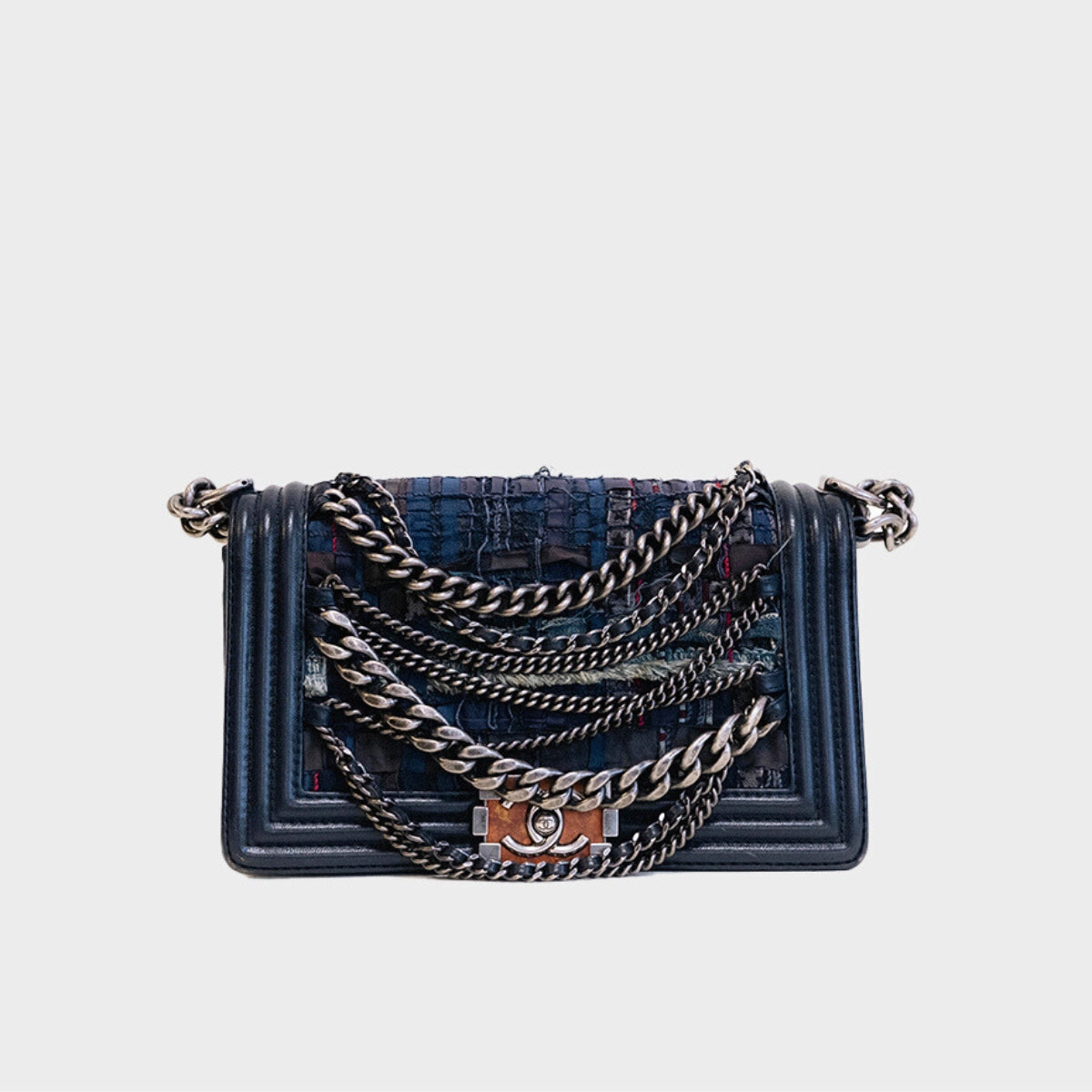 This 2014 version of the Chanel Medium Boy Bag is the perfect blend of timeless elegance and modern edge. Crafted with patchwork fabrics draped by silver chains with a black leather trim, this bag is an unexpected colourway to twist to any outfit. Inside, the bag offers ample space with a well-organised interior, including multiple compartments to keep your essentials secure and accessible. The adjustable strap allows for versatile styling options, from a chic shoulder bag to a convenient crossbody.