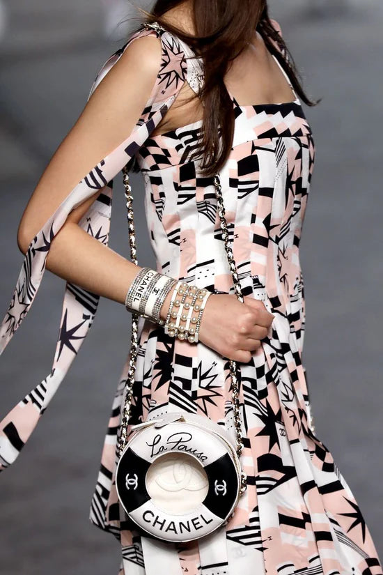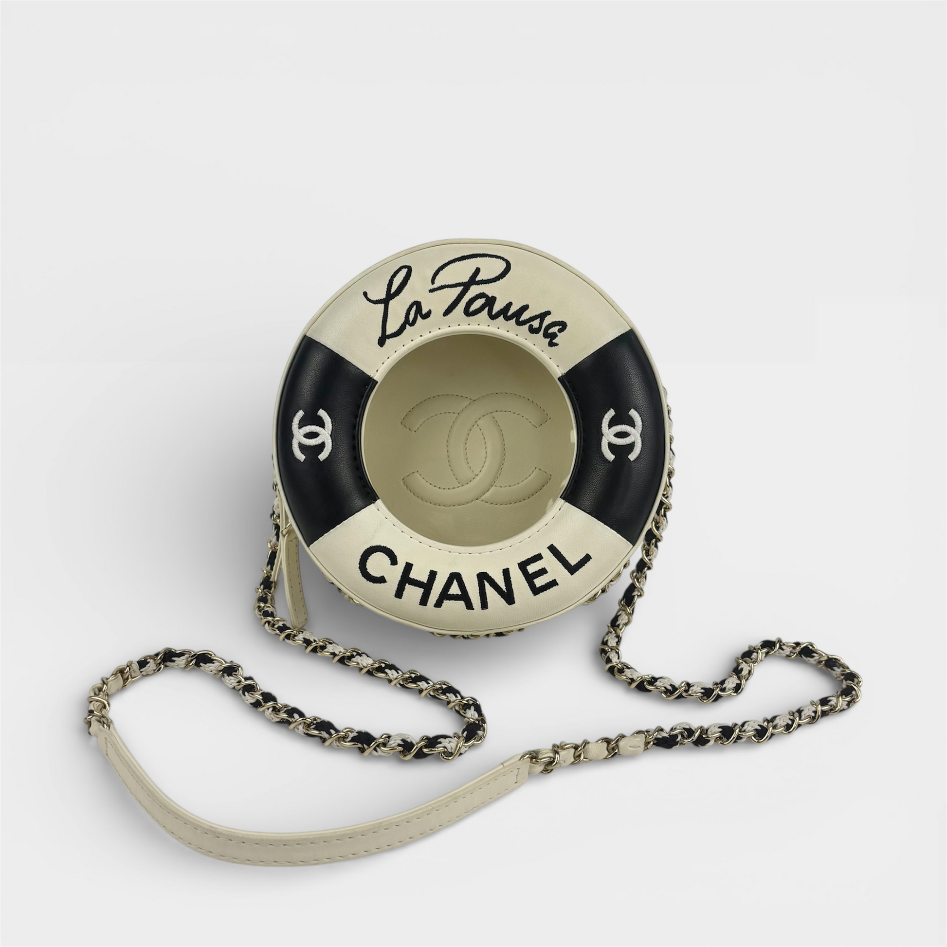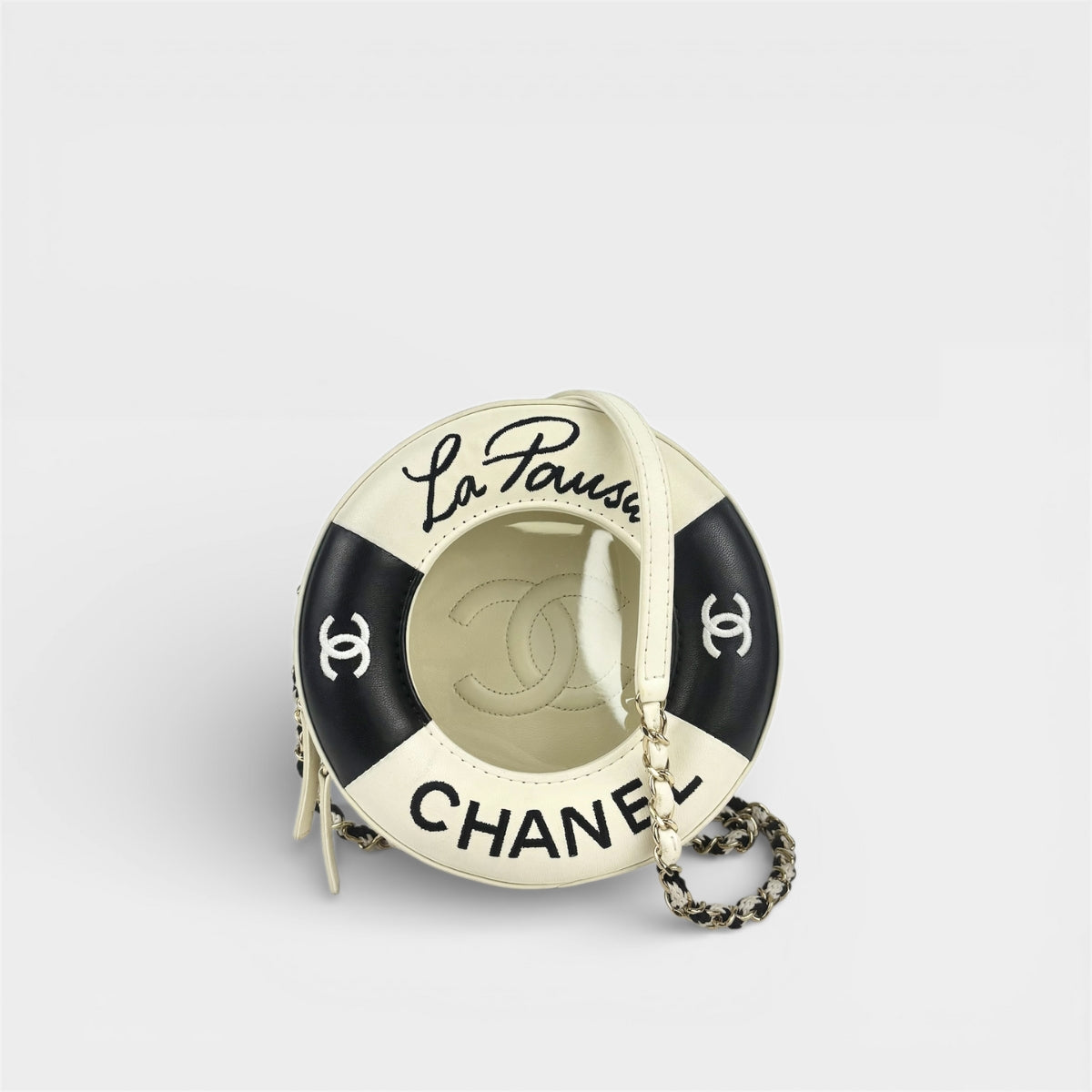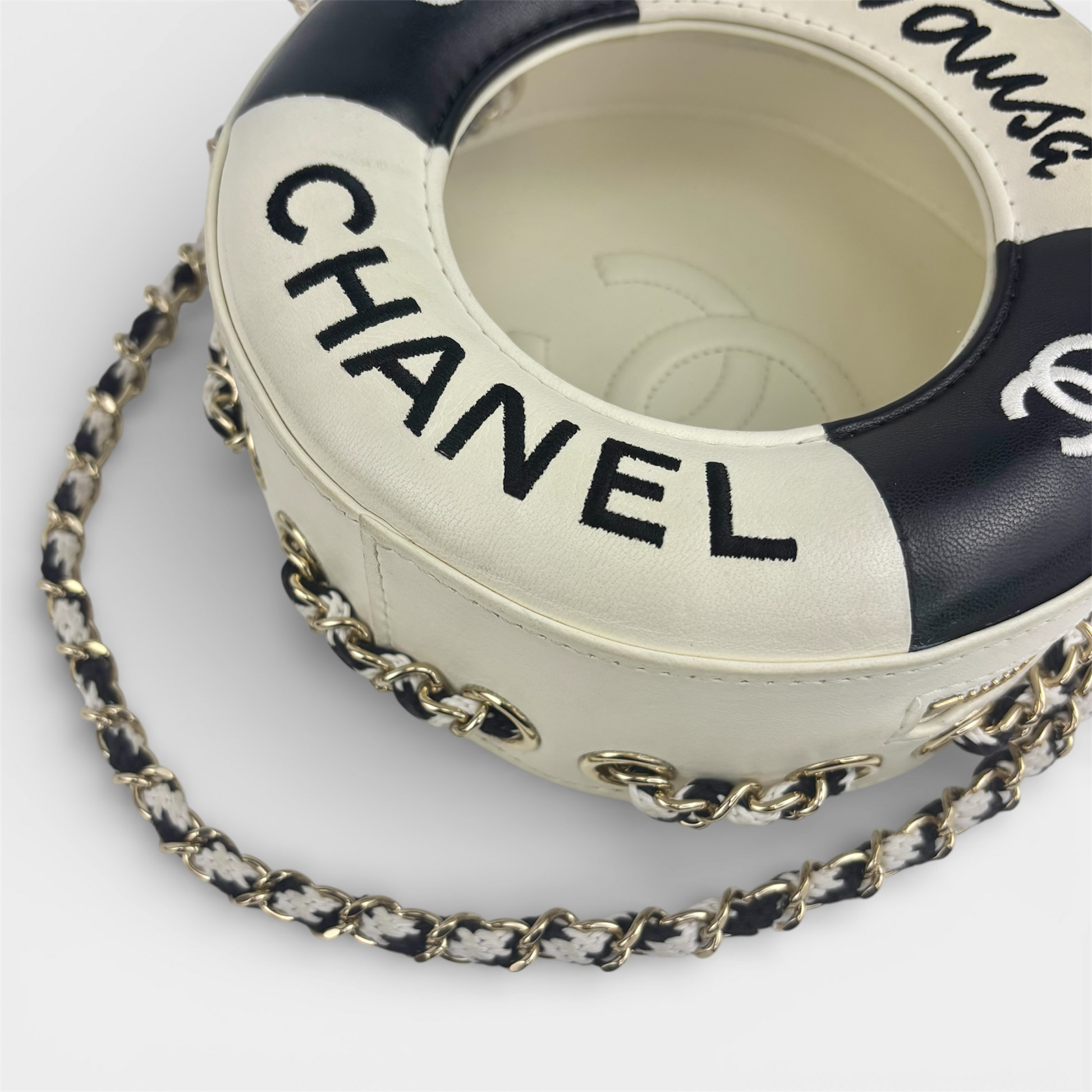 A true collector’s piece, the CHANEL La Pausa Coco Lifesaver Bag from the Cruise 2019 runway is one of the collection’s most playful and sought-after designs. Crafted in black and white lambskin with champagne gold hardware, this limited edition novelty bag takes its cues from Karl Lagerfeld’s nautical fantasy, featuring embroidered CC detailing, signature diamond quilting and a distinctive transparent centre inspired by classic lifesavers. On the runway, it was styled with oversized sunglasses, berets, rope detailing and crisp sailor silhouettes, perfectly capturing the collection’s maritime mood. Finished with a leather-and-chain crossbody strap and zip closure, this rare runway piece is as fun as it is iconic - a bold statement bag that captures Chanel at its most imaginative.