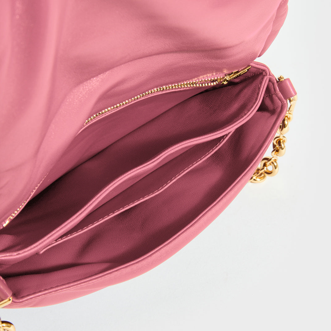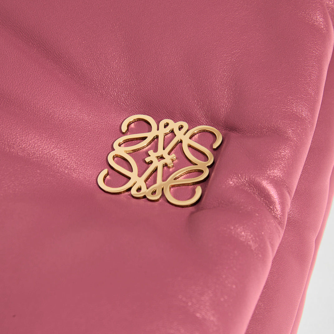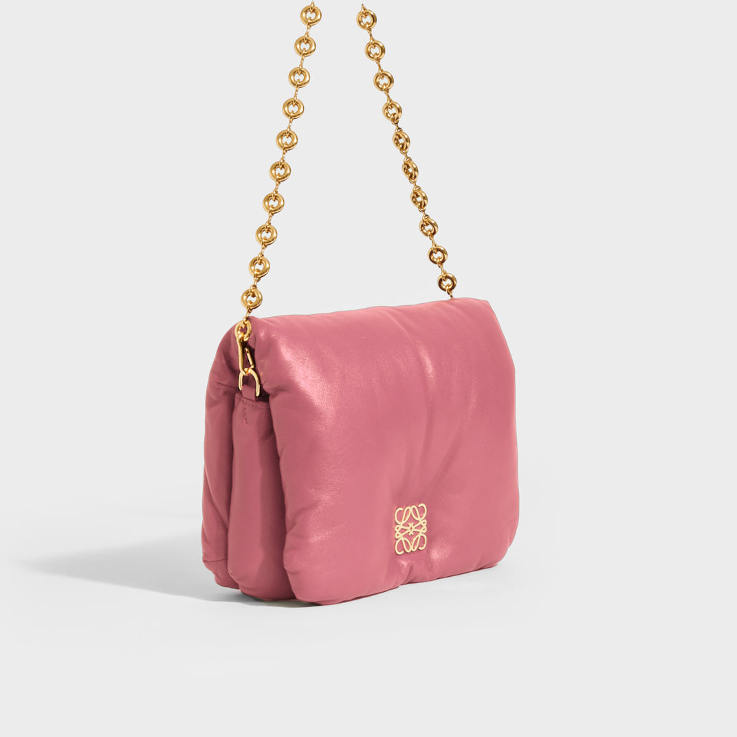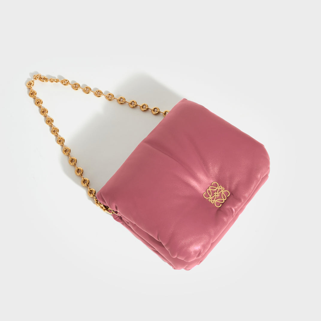 Reimagined with new proportions and a puffy, padded silhouette, the Small Puffer Goya Bag is one to try. Crafted from high-quality nappa calfskin and featuring the house's anagram logo in gold hardware, the bag is as tactile as it is visually stunning. Taking you from day to night, this small bag houses two internal compartments, magnetic closure and statement gold chain shoulder strap. Style with with neutral colours and let the pop of pink shine through.