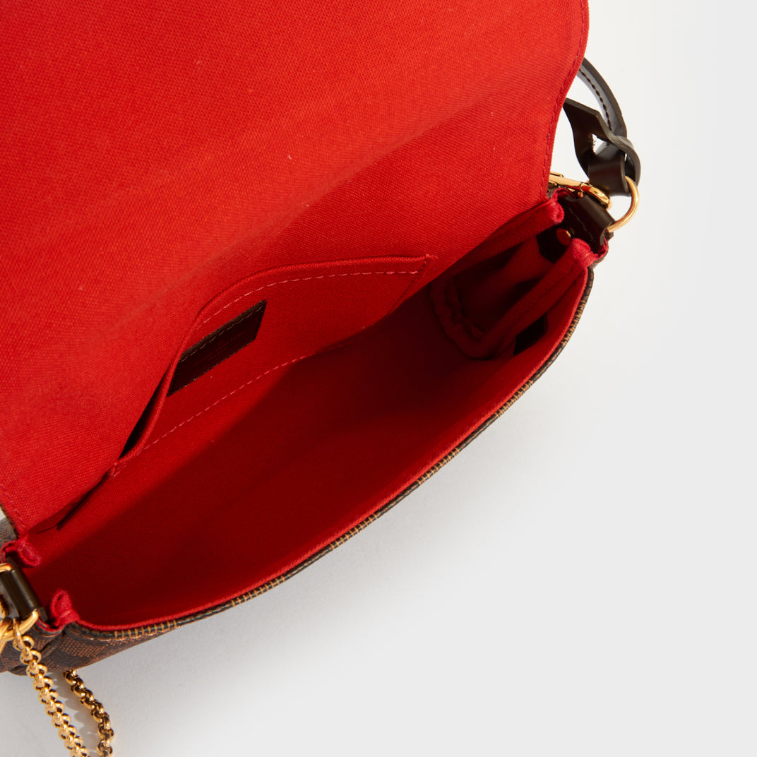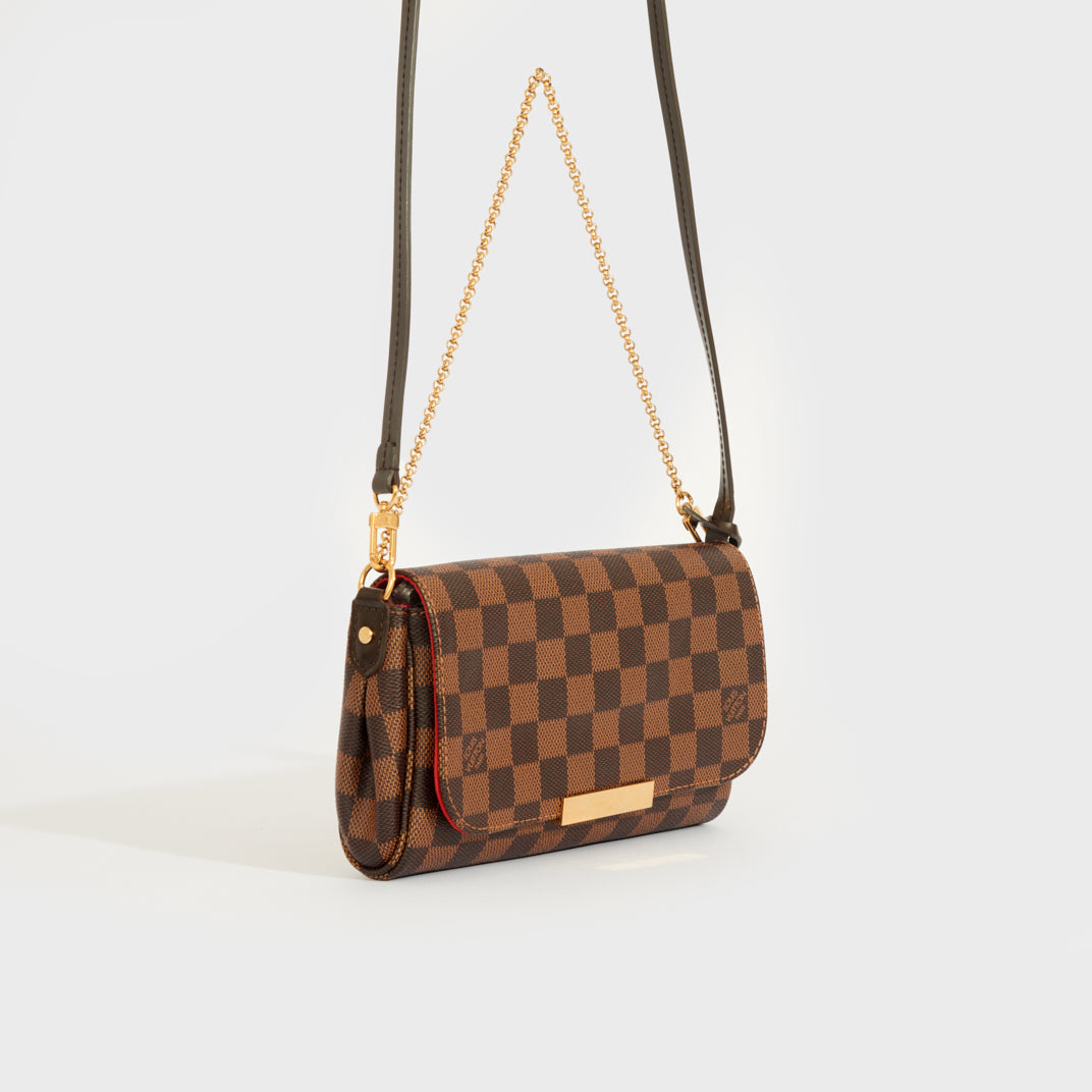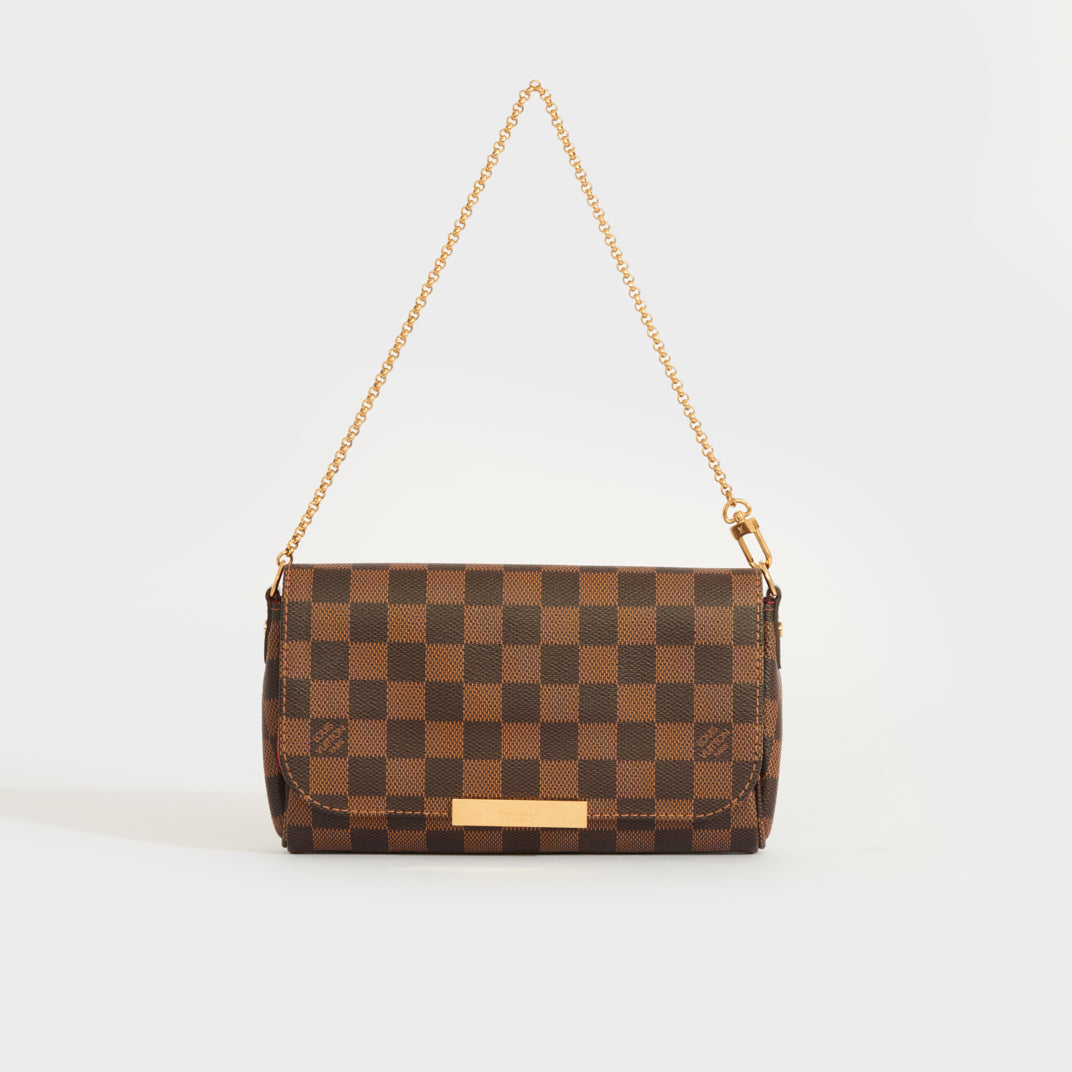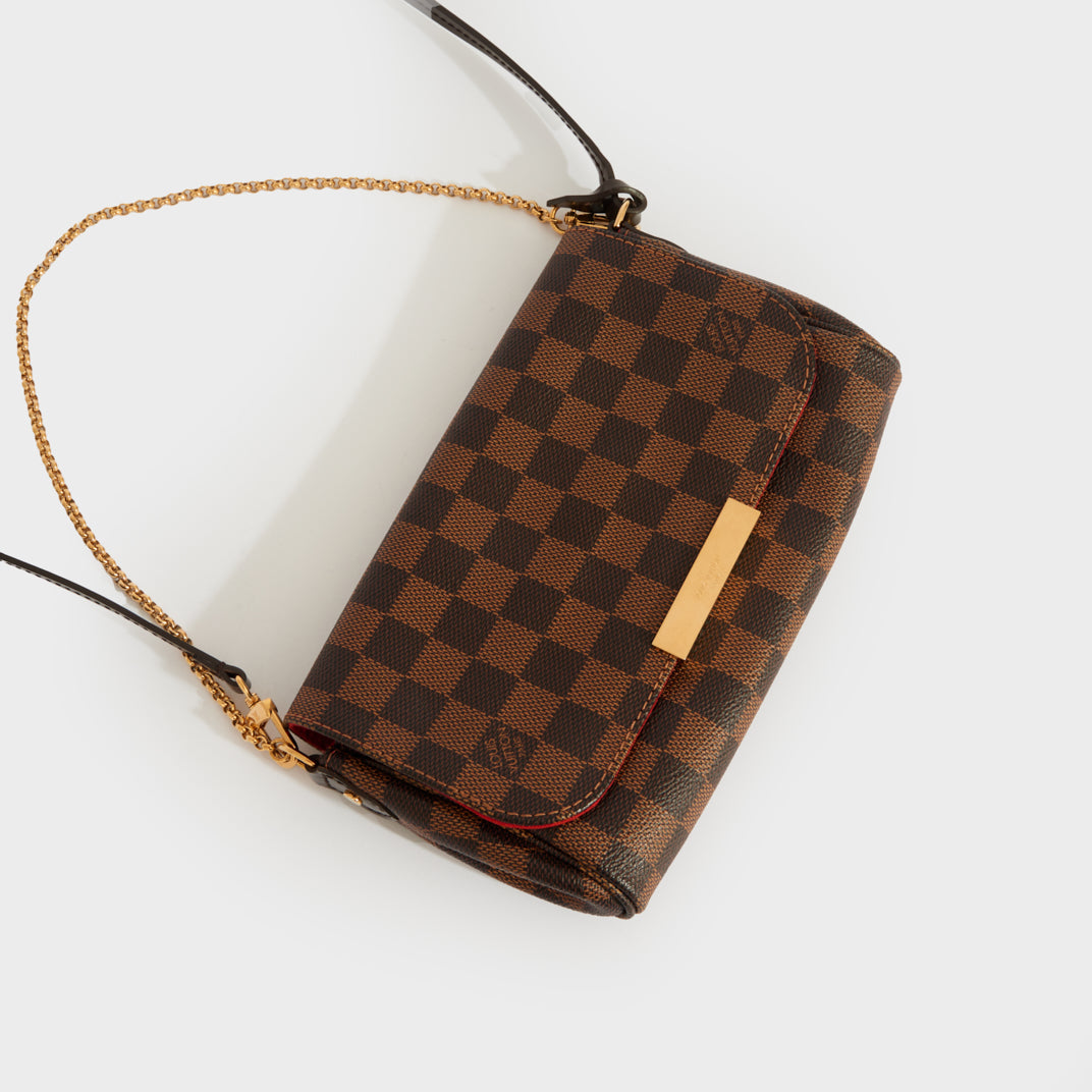 Louis Vuitton's Favorite PM Bag is a go-to evening bag. Be it dinner dates, cocktail parties or a wedding reception, its removable chain strap can take it from shoulder bag to a clutch in a matter of seconds. Coming in the Damier Ebene Canvas, a Louis Vuitton signature, it may come as no surprise that the instantly-recognisable checkerboard pattern is actually inspired by a chess board. The Favorite PM has a single compartment, a foldover flap closure and bold red fabric interior lining. The Louis Vuitton name is embossed on the front gold hardware, and inside is a patch pocket for essentials.
