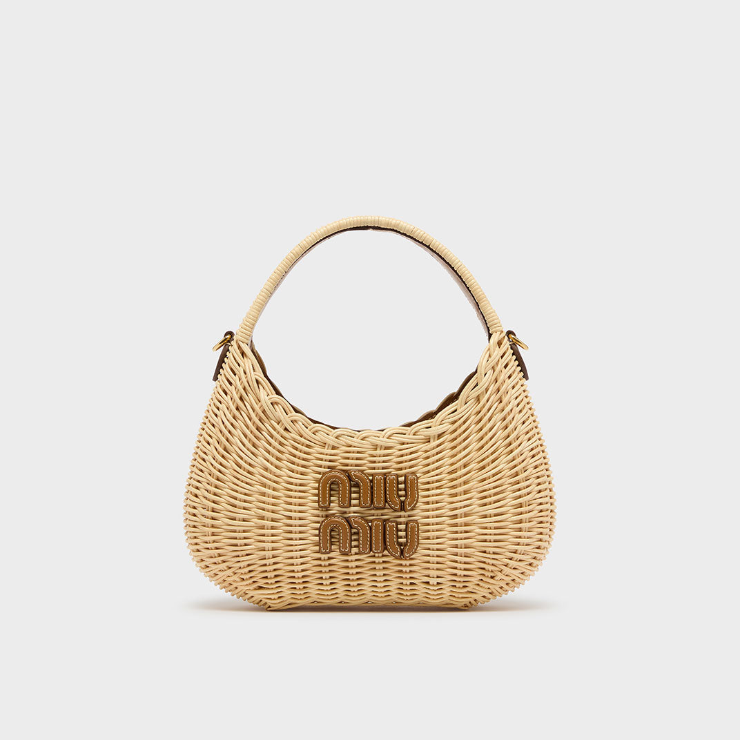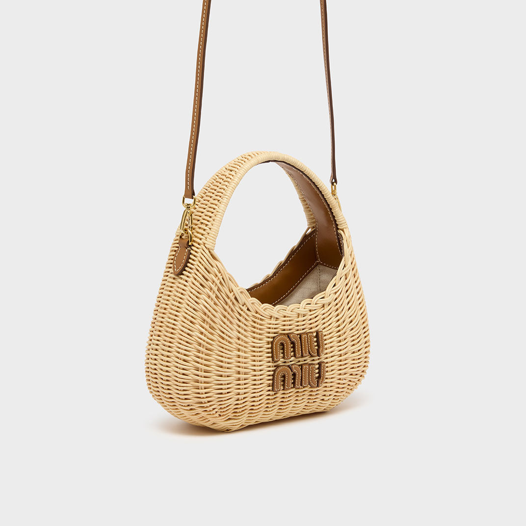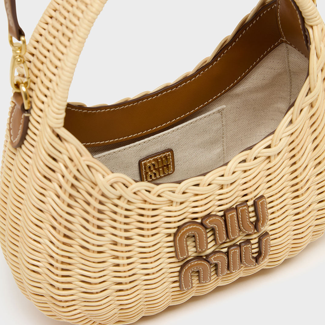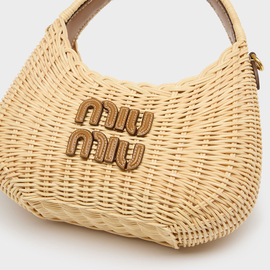 A reinterpreted staple from the Miu Miu collection, this updated Wander bag is made with woven wicker fabric and features a fun retro raffia-effect of the logo making it perfect for summer. The inside features linen lining and a small inner pocket for cards and keys. Take this bag for your brunch dates as a top handle or attach the leather shoulder strap and wear as a crossbody for weekend beach getaways!