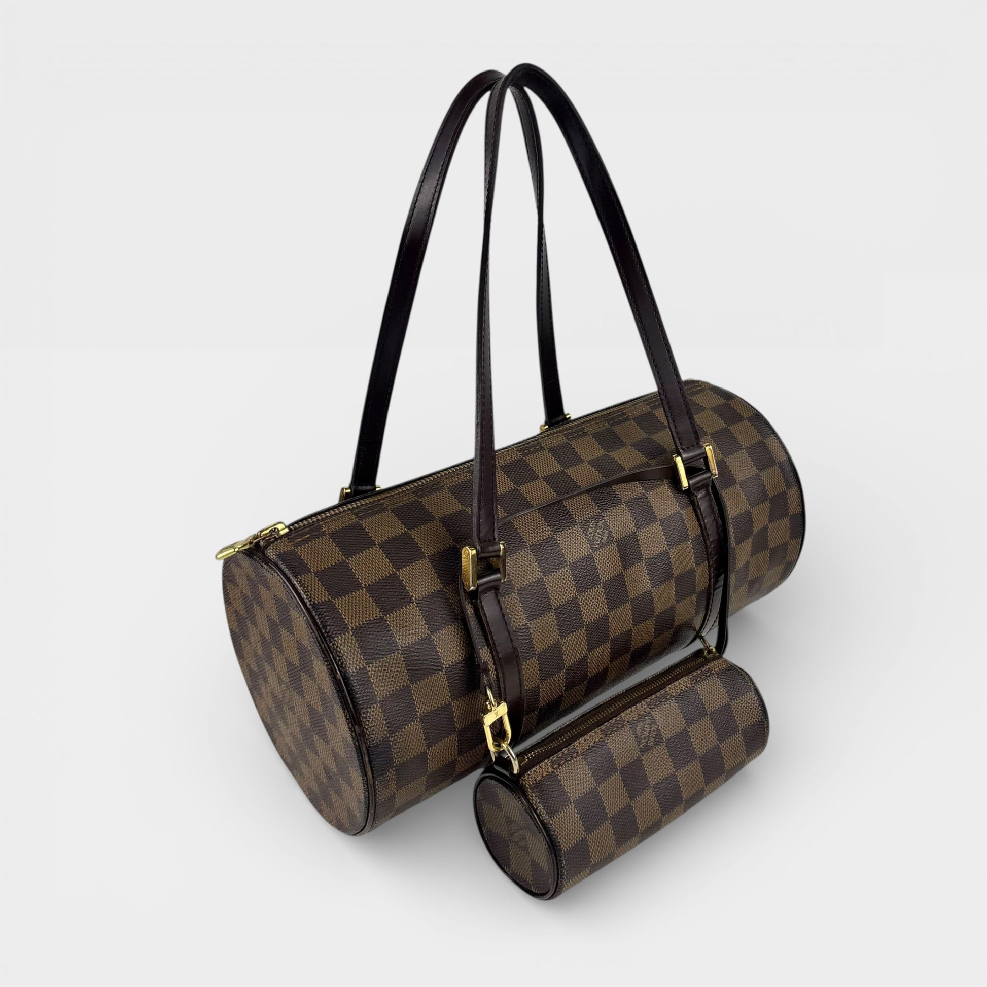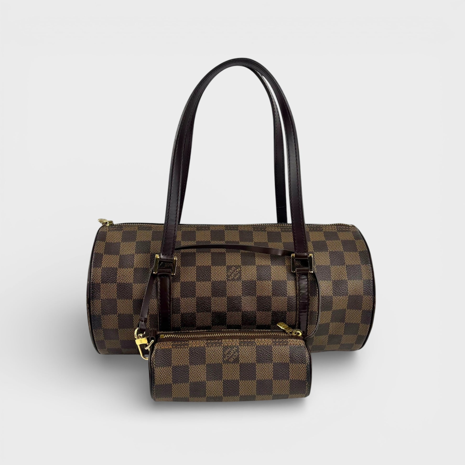 The Louis Vuitton Papillon 30 in Damier Ebène is a timeless classic from circa 2006, defined by its distinctive cylindrical silhouette and enduring appeal. Crafted in the house’s signature brown Damier Ebène canvas, it features smooth leather trim, dual top handles, and a secure top zip fastening. The spacious main compartment is finished with contrast lining and includes a removable pouch for added practicality. Completed with logo-engraved gold-tone hardware, this Papillon 30 is an elegant and functional icon of Louis Vuitton’s heritage design.