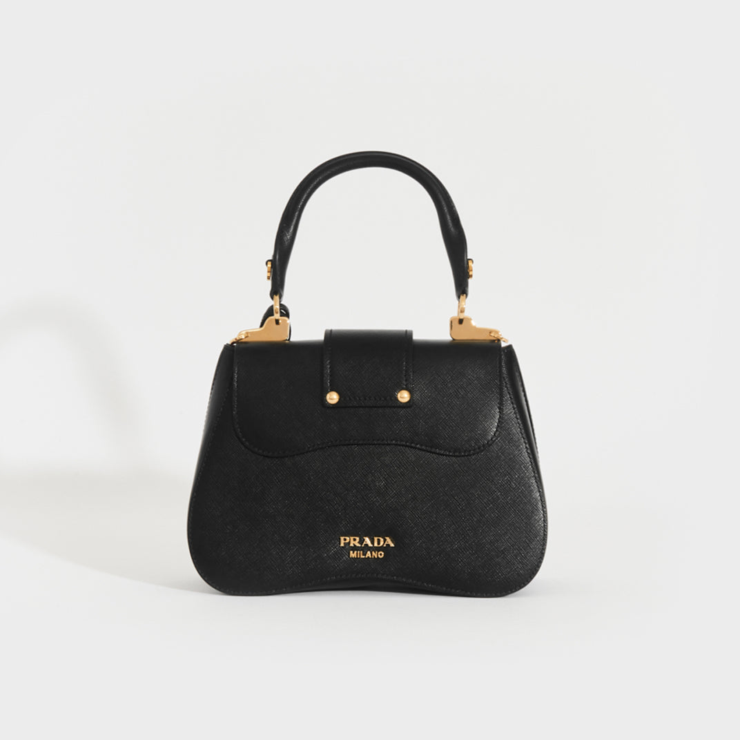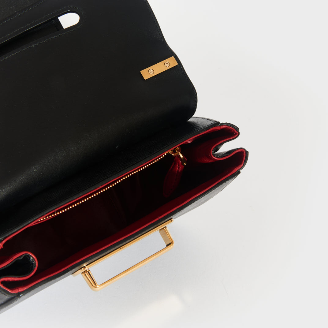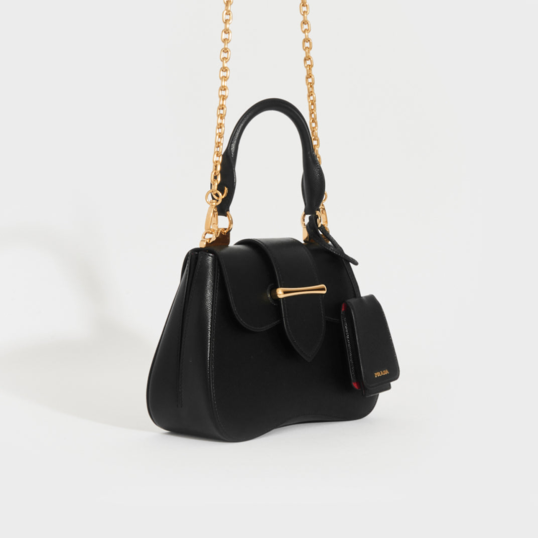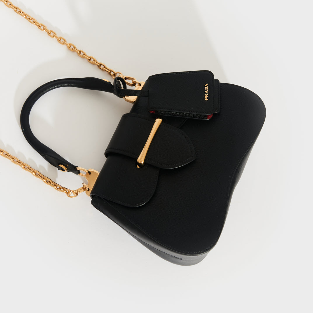First seen in Prada’s Resort 2019 show, the Sidonie bag is a sleek nod to early 2000s baguette style. Crafted from signature saffiano leather, its sculptural curved shape features gold-tone hardware, a slip-through closure, and a bold red leather interior with a zip pocket. Finished with a gold logo plaque and hang tag, it can be worn by the chain strap or carried by the top handle, perfect over a chunky coat or a sleek little black dress.