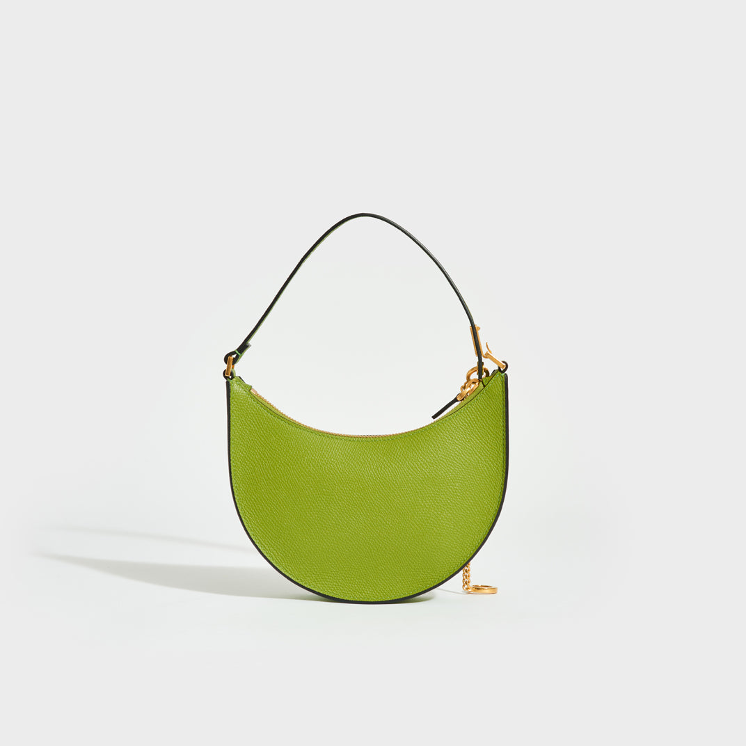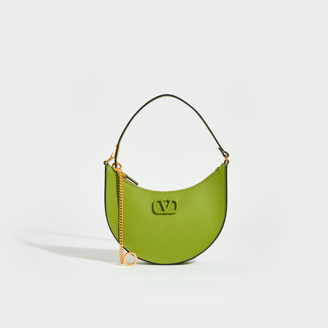Get ready to party with the cutest Valentino on the block. Crafted from a bold chartreuse green leather, this mini shoulder bag from Valentino features the iconic V-Logo hardware on a modern curved silhouette. The chain detail can extend the strap, allowing you to transfer seamlessly from a clutch to hands-free mode. The perfect piece of arm candy for your next night out!